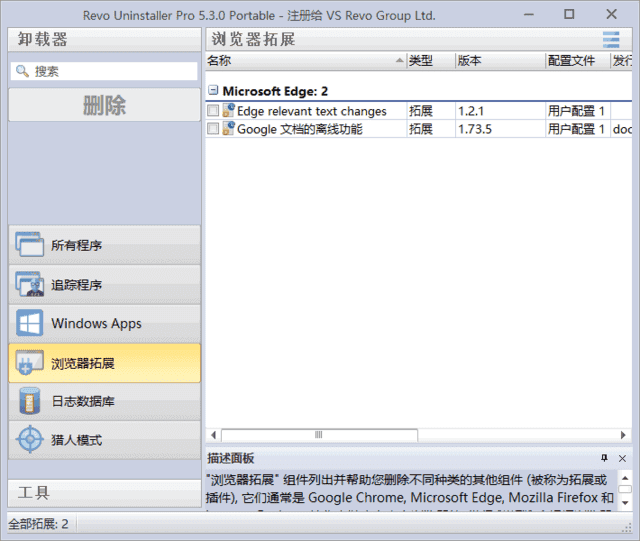 Revo Uninstaller中文版是一款专业的软件卸载工具的系统清理工具,这款Revo卸载器卸载软件功能包括了:猎人模式,安装追踪程序,强制卸载扫描分析,启动项管理器,垃圾文件清理,使用痕迹清理,浏览器扩展管理等.
